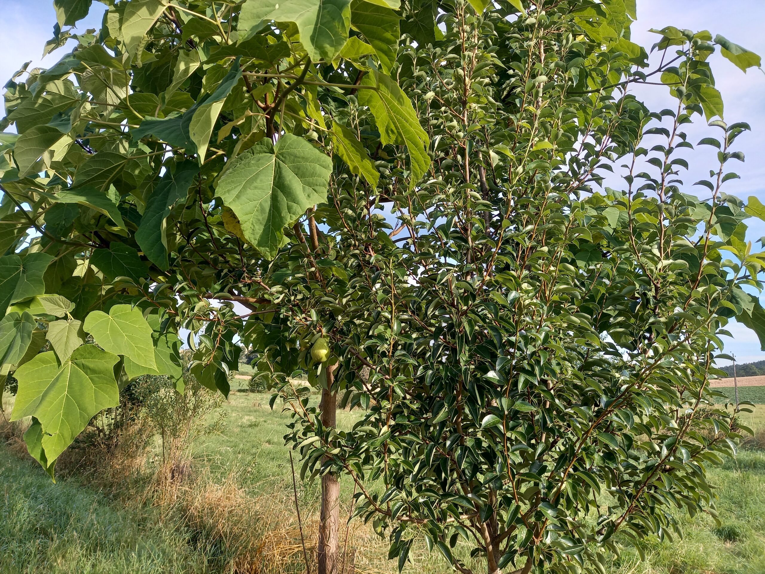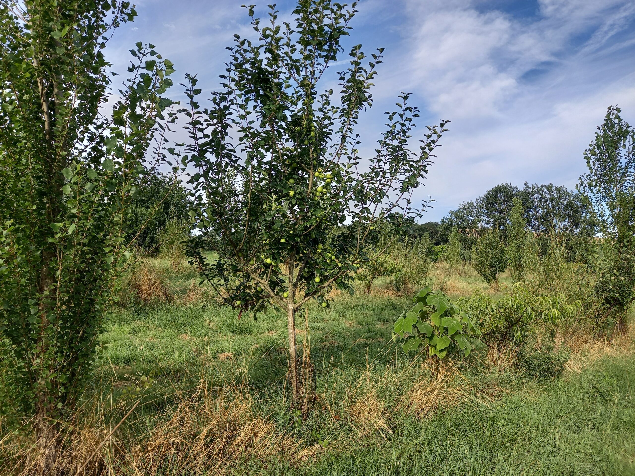 Une rencontre en 2018 avec des paysans brésiliens, qui pratiquent l’agroforesterie depuis plus de 25 ans, nous a inspirés pour l’implantation du verger. Les arbres sont plantés serrés sur les courbes de niveau. Ils sont espacés de seulement 1m80 et l’inter-rang est de 6m. Un arbre sur deux est un arbre fruitier, un arbre sur deux est un arbre compagnon qui n’a pas vocation à rester dans la plantation. Enfin, les porte-greffes utilisés sont variés, les arbres greffés sur francs sont espacés de 12m.